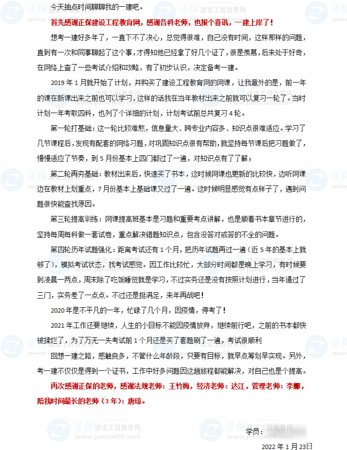 近期,建設(shè)工程教育網(wǎng)收到了一封來自一級建造師學(xué)員的感謝信。在信中,對建設(shè)工程教育網(wǎng)教學(xué)及服務(wù)工作給予了充分肯定,字里行間情真意切,并將考試的心路歷程也分享出來,希望對2022年學(xué)員有所幫助,跟著小編一起來看看吧!