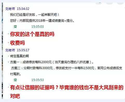 要是也有小伙伴遇到這種自稱(chēng)和內(nèi)部工作人員有合作可以提前查成績(jī)并且改分的,那一定就是騙子了,一級(jí)建造師考試作為國(guó)家級(jí)的考試由人事部、建設(shè)部共同組織實(shí)施,不會(huì)存在花錢(qián)改分的問(wèn)題,所有等成績(jī)實(shí)在無(wú)聊的話也可以和騙子聊一聊解悶像上面的考友一樣,但是提到交錢(qián)的話要趕緊撤或者跟相關(guān)部門(mén)舉報(bào)。