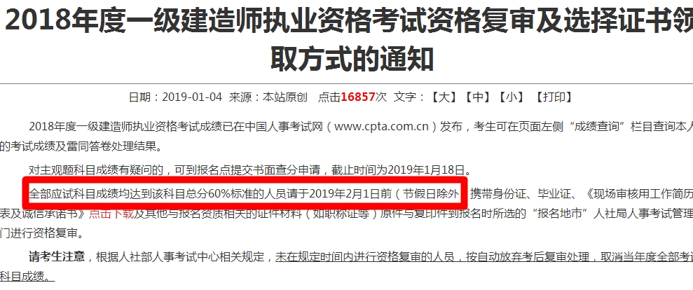 2018年一級建造師考試成績已公布,小伙伴們最關心的就是合格標準了,近幾年一級建造師的合格標準都為總成績的60%雷打不動,2018年的合格標準雖然還沒公布但基本也是如此,在1月3日西藏公布的考后復核文件,1月4日云南考后復核文件,1月9日重慶和1月11日廣東公布的考后復核文件中都寫到復核分數(shù)線為總成績的60%