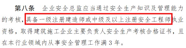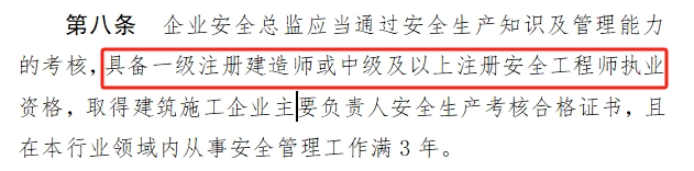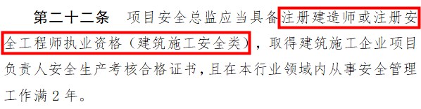 摘要:住建部發(fā)布《建筑施工企業(yè)、 工程項目安全生產管理機構設置及安全生產 管理人員配備辦法(征求意見稿)》 ,文中提到“企業(yè)安全總監(jiān)應當通過安全生產知識及管理能力的考核,具備一級注冊建造師或中級及以上注冊安全工程師執(zhí)業(yè)資格”以及“項目安全總監(jiān)應當具備注冊建造師或注冊安全工程師執(zhí)業(yè)資格(建筑施工安全類)”。