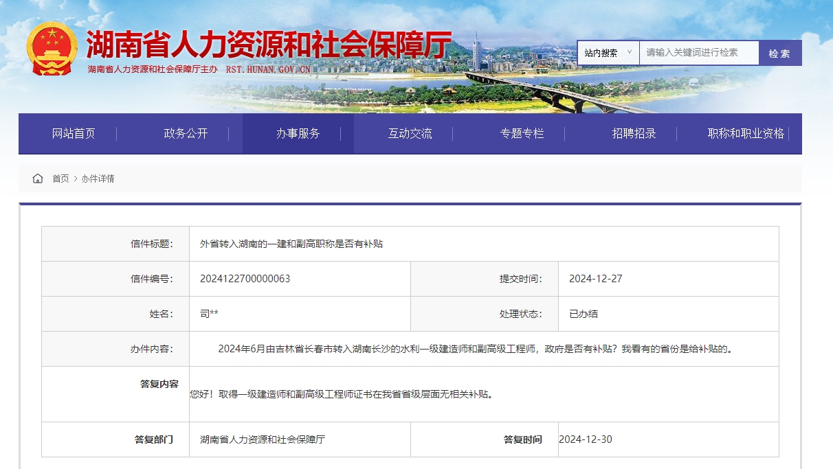 湖南省人社廳回復(fù): 取得一級(jí)建造師證書在我省省級(jí)層面無相關(guān)補(bǔ)貼
