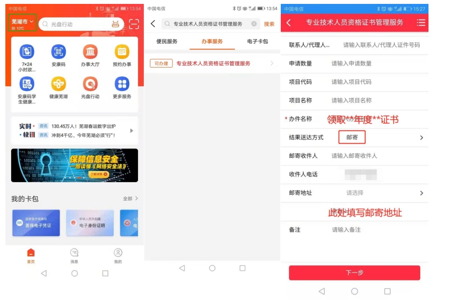 郵寄方式:方式1:移動(dòng)端申請(qǐng)(推薦使用),手機(jī)下載皖事通APP,城市選擇蕪湖,搜索欄搜索“專業(yè)技術(shù)人員資格證書管理服務(wù)”,在線辦理。
