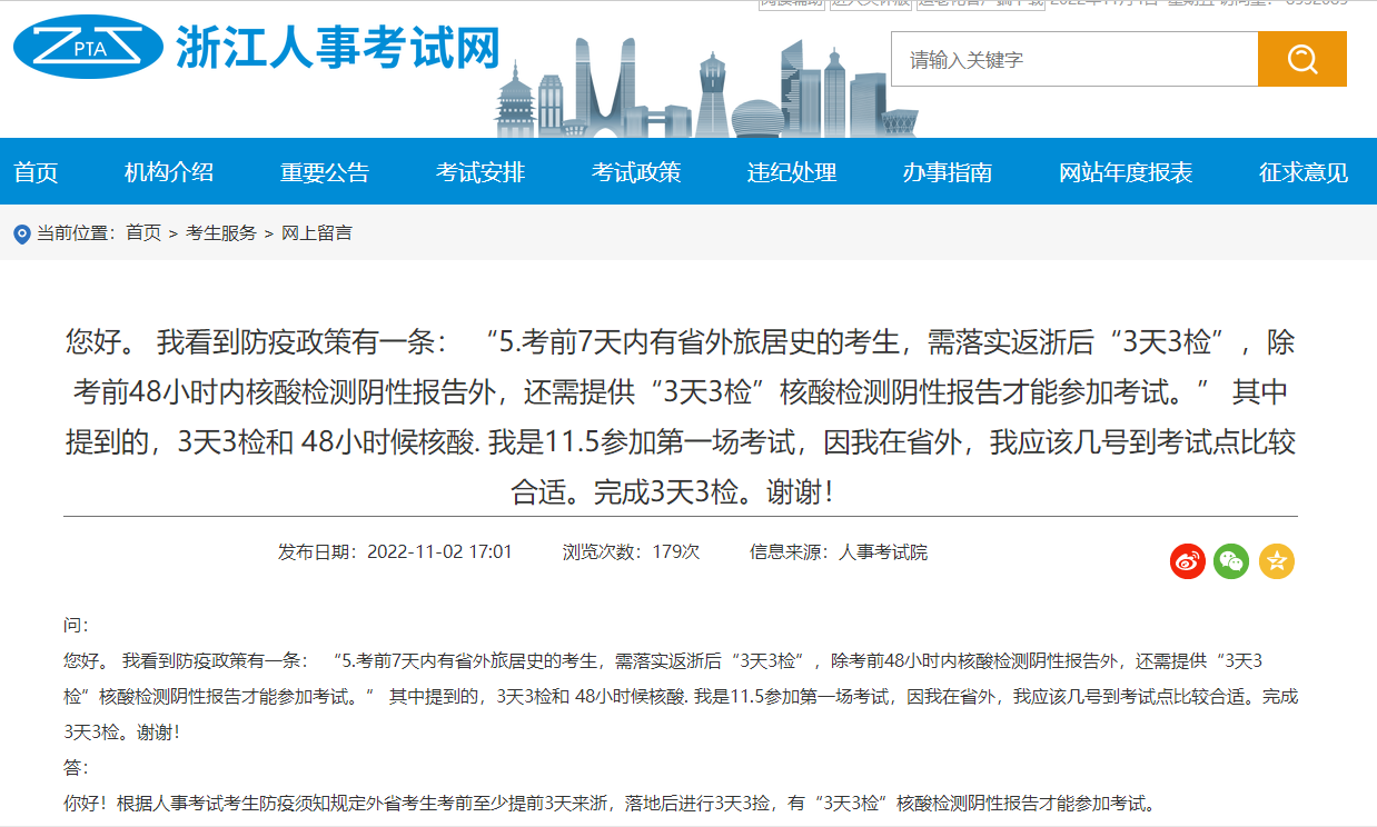 官方回復:“你好!根據(jù)人事考試考生防疫須知規(guī)定外省考生考前至少提前3天來浙,落地后進行3天3撿,有“3天3檢”核酸檢測陰性報告才能參加考試?!?/p>