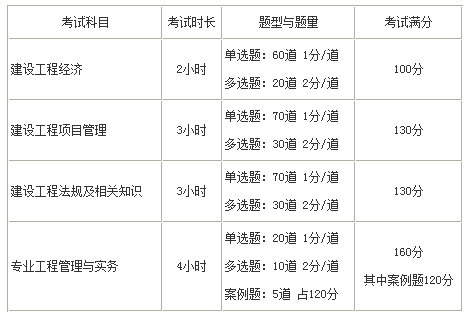 《建設工程經(jīng)濟》考試時間為2小時,《建設工程項目管理》考試時間為3小時,《建設工程法規(guī)及相關知識》考試時間為3小時,《專業(yè)工程管理與實務》考試時間為4小時。
