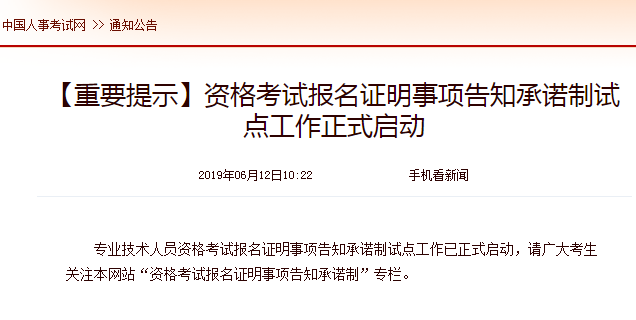 2019年6月12日,中國(guó)人事考試網(wǎng)發(fā)布了正式啟動(dòng)資格考試報(bào)名證明事項(xiàng)告知承諾制試點(diǎn)工作的通知: