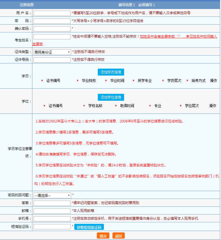1、 報(bào)考人員必須先進(jìn)行注冊(cè),注冊(cè)后系統(tǒng)將對(duì)身份、學(xué)歷學(xué)位、所學(xué)專(zhuān)業(yè)等信息進(jìn)行在線核驗(yàn),核驗(yàn)通過(guò)才能進(jìn)行報(bào)名操作;