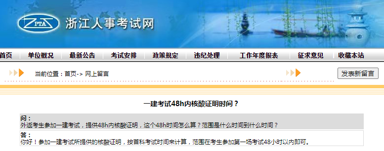 浙江人事考試網(wǎng)回復(fù)考生關(guān)于參加一級建造師考試提供的48小時(shí)內(nèi)核酸證明具體計(jì)算范圍相關(guān)問題,內(nèi)容如下: