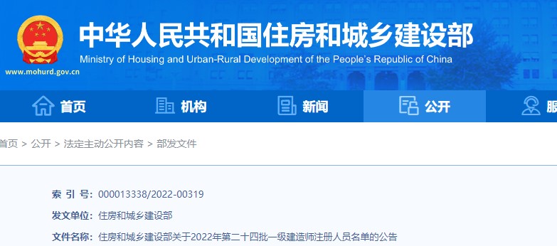 住房和城鄉(xiāng)建設(shè)部關(guān)于2022年第二十四批一級(jí)建造師注冊(cè)人員名單的公告