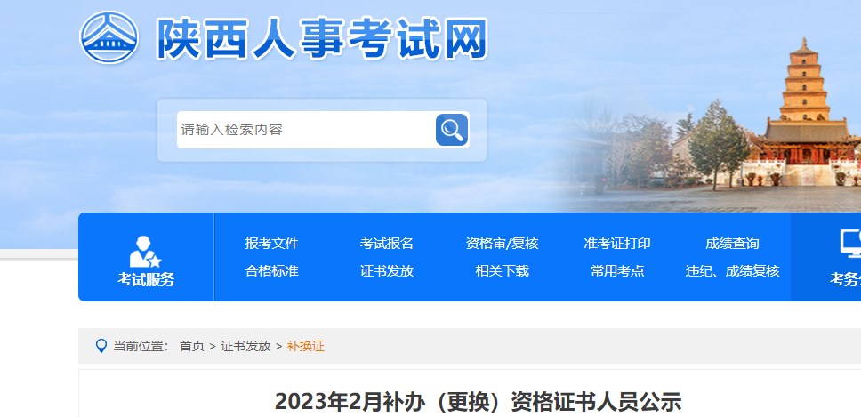 2023年2月補(bǔ)辦(更換)資格證書的人員已公示,會計(jì)、審計(jì)和房地產(chǎn)估價(jià)師不在公示范圍。公示期2023年2月24日至2023年3月2日。如對公示結(jié)果有異議,可向陜西省人事考試中心反映,證書領(lǐng)取另行通知,請關(guān)注本網(wǎng)站或公眾微信號sxrskswx。