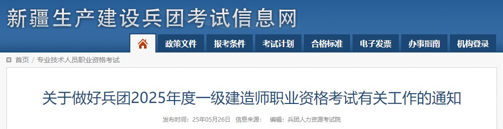 新疆生產(chǎn)建設(shè)兵團考試信息網(wǎng)發(fā)布關(guān)于做好兵團2025年度一級建造師職業(yè)資格考試有關(guān)工作的通知,具體信息如下: