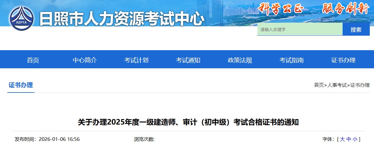日照市人力資源考試中心發(fā)布關(guān)于辦理2025年度一級建造師、審計(初中級)考試合格證書的通知,具體信息如下: