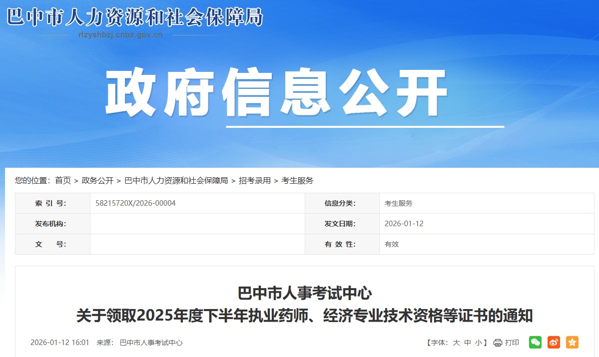 巴中市人事考試中心關(guān)于領(lǐng)取2025年度下半年執(zhí)業(yè)藥師、經(jīng)濟專業(yè)技術(shù)資格等證書的通知,具體信息如下: