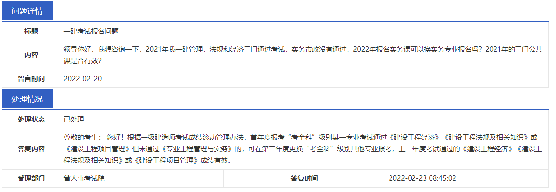 在一建考試中,如果第一年考過了《建設(shè)工程經(jīng)濟(jì)》、《建設(shè)工程項目管理》和《建設(shè)工程法規(guī)及相關(guān)知識 》只有《專業(yè)工程管理與實務(wù)》沒通過,第二年想換其他專業(yè)報考,3門公共科的成績還有效嗎?官方回復(fù)來了!