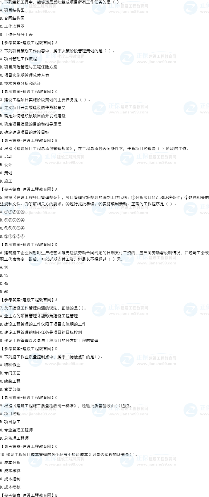 2022年一級(jí)建造師補(bǔ)考項(xiàng)目管理試題及答案1-10題。建設(shè)工程教育網(wǎng)考后將會(huì)根據(jù)學(xué)員反饋,及時(shí)匯總2022年一級(jí)建造師補(bǔ)考項(xiàng)目管理試題及答案分享給大家,并且會(huì)及時(shí)做出答案解析,希望能為廣大一建考生朋友帶來幫助。