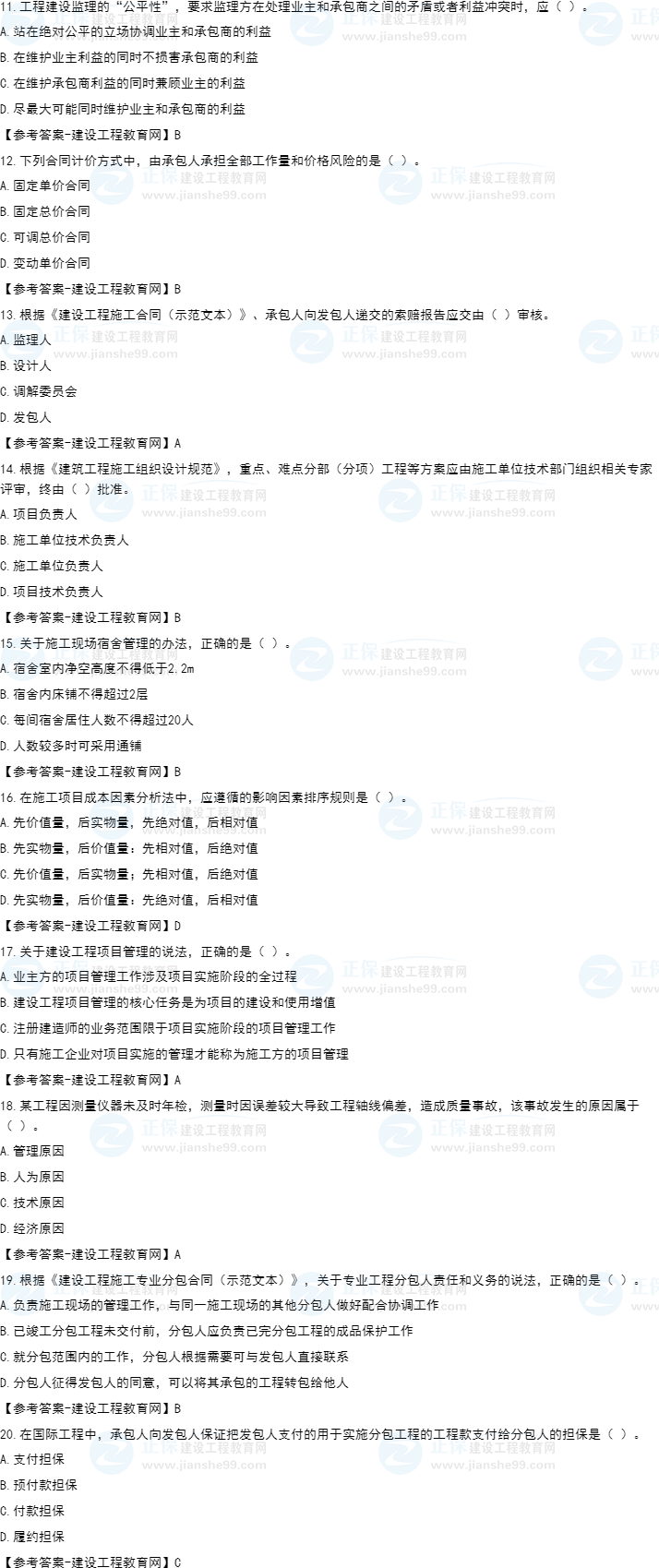 2022年一級(jí)建造師補(bǔ)考項(xiàng)目管理試題及答案11-20題。建設(shè)工程教育網(wǎng)考后將會(huì)根據(jù)學(xué)員反饋,及時(shí)匯總2022年一級(jí)建造師補(bǔ)考項(xiàng)目管理試題及答案分享給大家,并且會(huì)及時(shí)做出答案解析,希望能為廣大一建考生朋友帶來幫助。