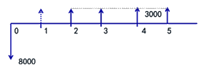 于是,根據(jù)財務(wù)凈現(xiàn)值的計算公式(1025),則有該方案的FNPV=-8000+3000(P/A,10%,4)×(P/F,10%,1)=-8000+3000×3.1699×0.909=645(萬元)。同時,根據(jù)靜態(tài)投資回收期的計算公式(思路),則有3000×3-8000=1000(大于零),由于運營期的1年+,進(jìn)而算出靜態(tài)投資回收期為3.67年。參見教材P22~25。