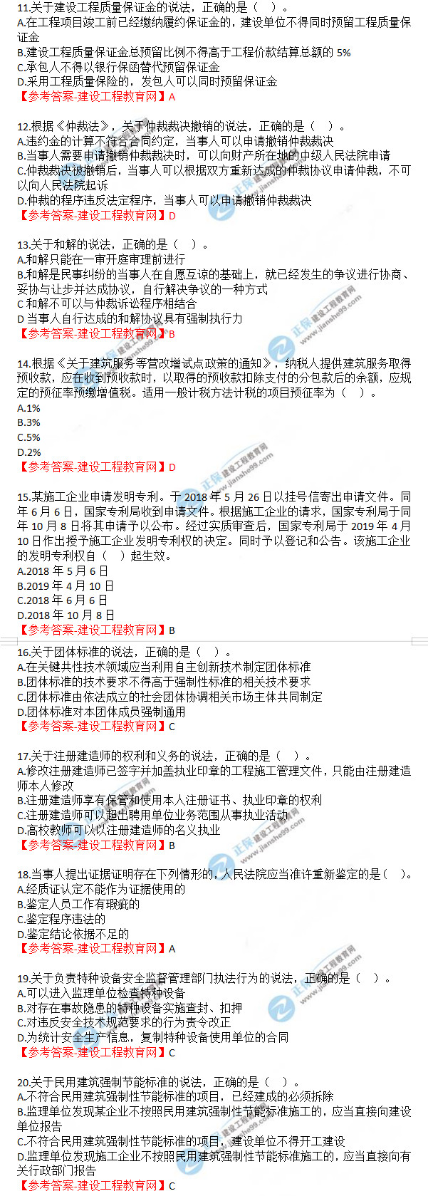 2019年一級建造師《建設(shè)工程法規(guī)及相關(guān)知識》試題答案及解析11-20