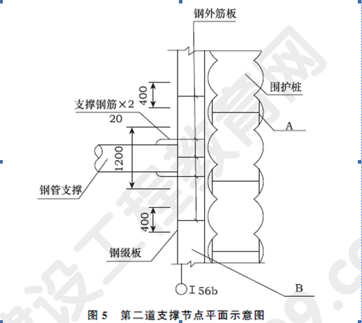 某施工單位中標(biāo)承建過(guò)街地下通道工程,周邊地下管線較復(fù)雜,設(shè)計(jì)采用明挖順作法施工,通道基坑總長(zhǎng)80m,寬12m,開(kāi)挖深度10m;基坑圍護(hù)結(jié)構(gòu)采用SMW工法樁,基坑的深度方向設(shè)有2道支撐,其中第一道支撐為鋼筋混凝土支撐,第二道支撐為φ609×16mm鋼管支撐(見(jiàn)圖5)。基坑場(chǎng)地地層自上而下依次為:2.0m厚素填土、6m厚黏質(zhì)粉土、10m厚砂質(zhì)粉土,地下水位埋深約1.5m。在基坑內(nèi)布置了5口管井降水。