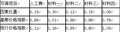 事件六:合同中約定,根據(jù)人工費(fèi)和四項(xiàng)主要材料和價(jià)格指數(shù)對(duì)總造價(jià)按調(diào)值公式法進(jìn)行調(diào)整。各調(diào)值因素的比重、基準(zhǔn)和現(xiàn)行價(jià)格指數(shù)如下表: