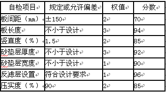 軟基處理完成后,施工單位對(duì)“軟土地基”分項(xiàng)工程按《公路工程質(zhì)量檢驗(yàn)評(píng)定標(biāo)準(zhǔn)》進(jìn)行了自檢,對(duì)7個(gè)實(shí)測(cè)項(xiàng)目按百分制進(jìn)行評(píng)分、自檢結(jié)果如表1: