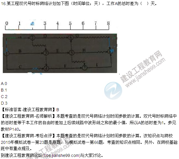 【建設(shè)工程教育網(wǎng)-考后點評】本題考查的是雙代號網(wǎng)絡(luò)計劃時間參數(shù)的計算。該知識點與網(wǎng)校2015年模擬試卷(一)第66題,模擬試卷(三)第21題,預測試卷第35題考查的基本相同。相關(guān)知識在建設(shè)工程項目管理基礎(chǔ)班中有相應講解。