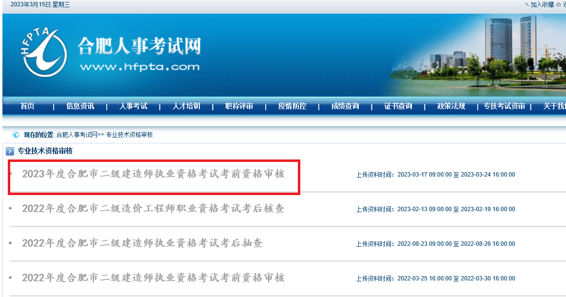 1、登錄合肥人事考試網(wǎng)()點(diǎn)擊“專技考試資審”欄(如附圖1)。