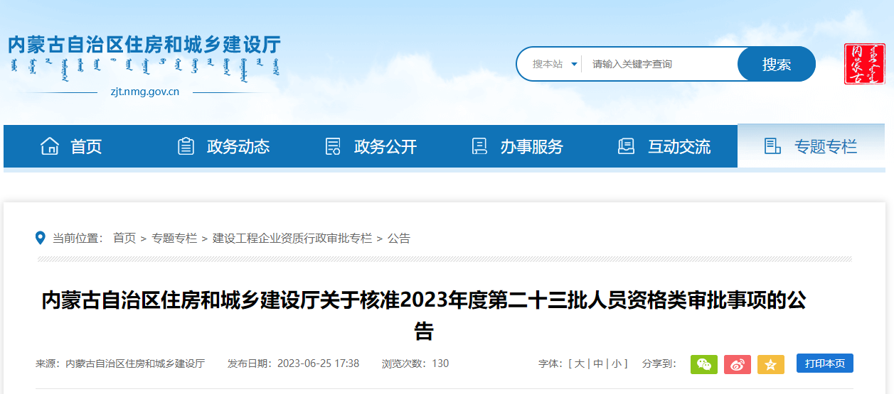 內(nèi)蒙古自治區(qū)住建廳關(guān)于核準2023年度第二十三批二級建造師人員資格類審批事項的公告
