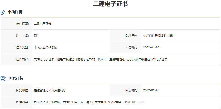 隨著2021年二級(jí)建造師證書(shū)的陸續(xù)領(lǐng)取,有很多同學(xué)對(duì)證書(shū)的咨詢(xún)比較關(guān)注,那么你的二級(jí)建造師證書(shū)是紙質(zhì)版還是電子版的呢?福建省的學(xué)員就這個(gè)問(wèn)題咨詢(xún)了福建省住房和城鄉(xiāng)建設(shè)廳,現(xiàn)已給出官方回復(fù):目前福建省二級(jí)建造師資格證是紙質(zhì)版,后續(xù)會(huì)有電子版,請(qǐng)關(guān)注我廳官網(wǎng)“行業(yè)管理--執(zhí)業(yè)注冊(cè)”專(zhuān)欄。