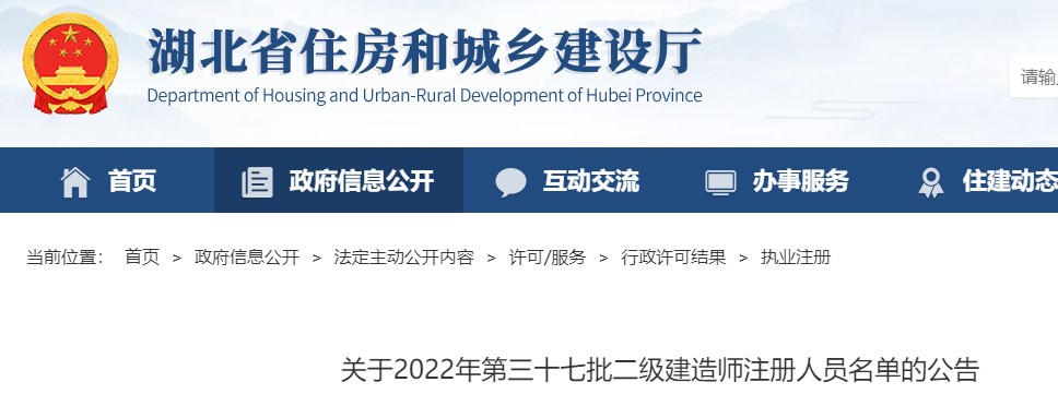 湖北省?關于2022年第三十七批二級建造師注冊人員名單的公告