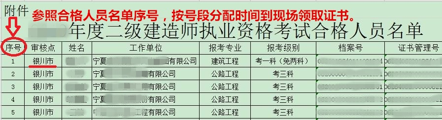 例:(如下圖所示,序號(hào)在800以內(nèi)(含800),審核點(diǎn)為銀川市的合格考生在2月26日領(lǐng)取證書。)