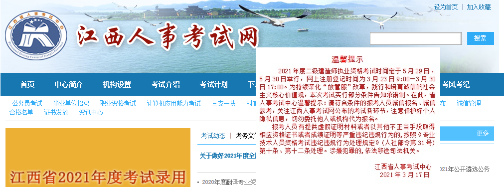 江西人事考試網(wǎng)發(fā)布2021年二級建造師考試報名溫馨提示,請江西二建考生仔細閱讀,做好報名準備。
