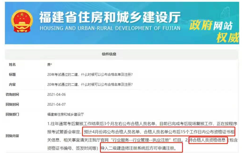 福建省住房和城鄉(xiāng)建設(shè)廳網(wǎng)站消息顯示,2020年福建二級建造師預(yù)計4月份公布合格名單,待合格人員資格信息導(dǎo)入二級建造師注冊系統(tǒng)后方可申請注冊。