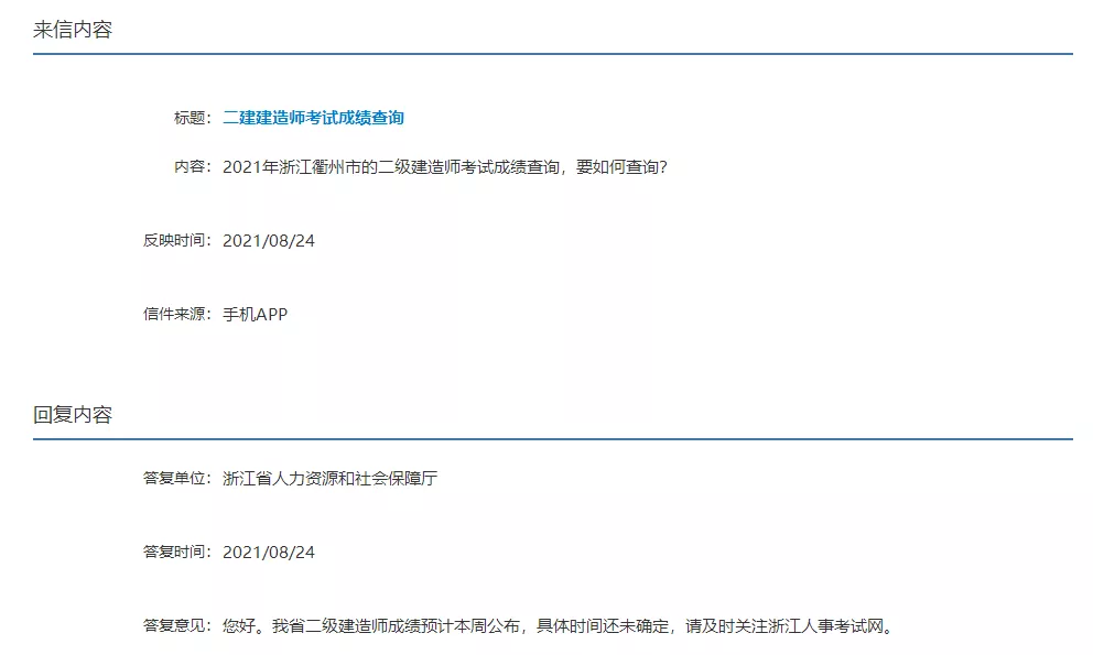 浙江省人力資源和社會(huì)保障廳網(wǎng)站回復(fù):您好,我省二級(jí)建造師成績(jī)預(yù)計(jì)本周公布,具體時(shí)間還未確定,請(qǐng)及時(shí)關(guān)注浙江人事考試網(wǎng)。