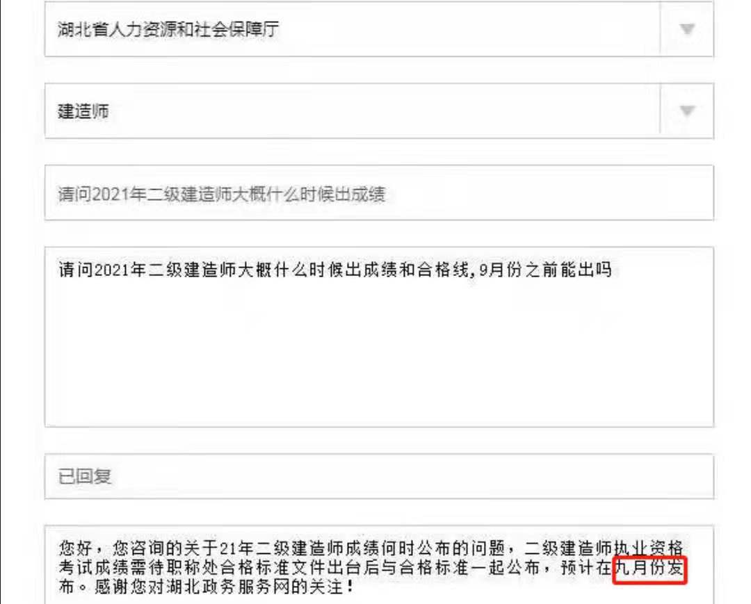 湖北省人力資源和社會保障廳網(wǎng)站回復(fù):二級建造師執(zhí)業(yè)資格考試成績需待職稱處合格標(biāo)準(zhǔn)文件出臺后與合格標(biāo)準(zhǔn)一起公布,預(yù)計在9月份發(fā)布。