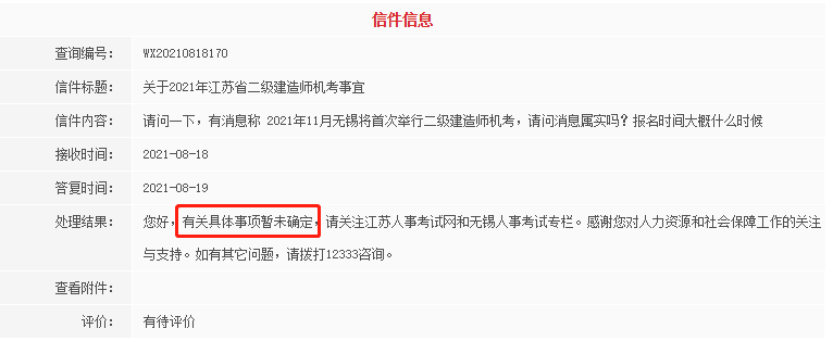 信件內(nèi)容:請(qǐng)問一下,有消息稱:2021年11月無錫將首次舉行二級(jí)建造師機(jī)考,請(qǐng)問消息屬實(shí)嗎?報(bào)名時(shí)間大概什么時(shí)候?