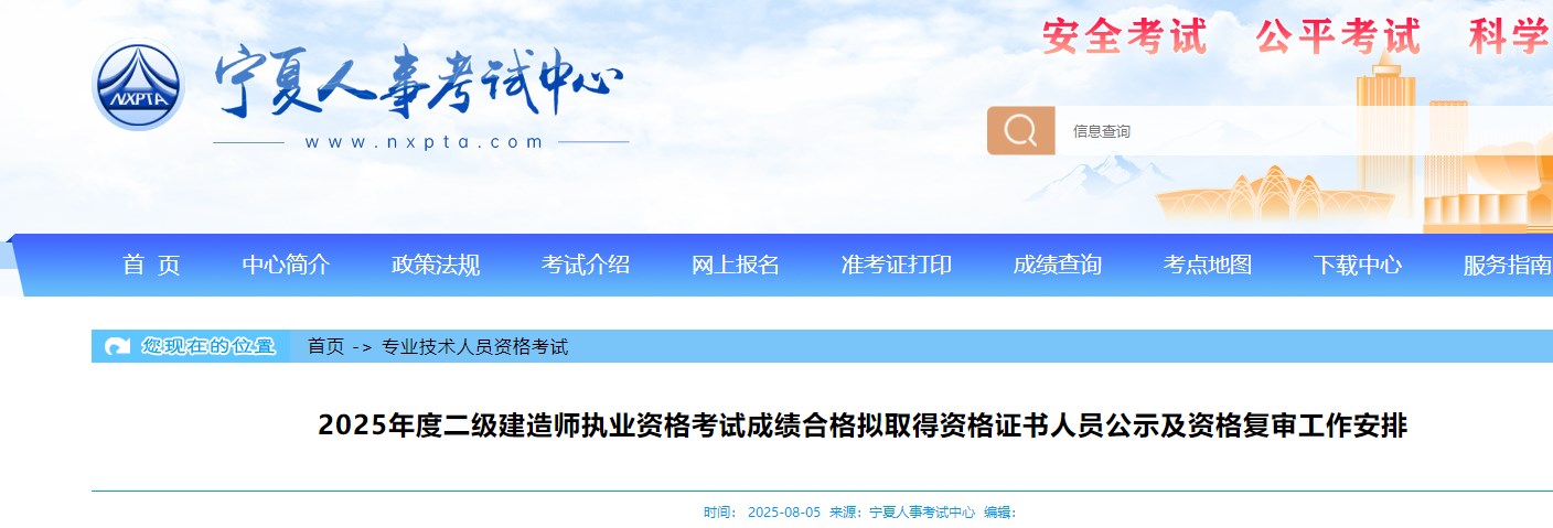 寧夏人事考試中心發(fā)布2025年度二級建造師執(zhí)業(yè)資格考試成績合格擬取得資格證書人員公示及資格復(fù)審工作安排,具體信息如下: