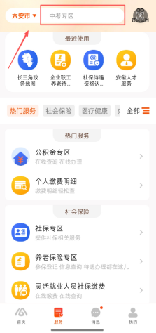 1.打開(kāi)皖事通APP并登錄,定位到“六安市”,點(diǎn)擊首頁(yè)“搜索框”。