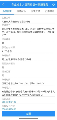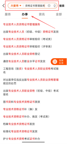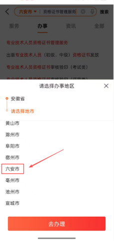 2.輸入“專(zhuān)業(yè)技術(shù)人員資格證書(shū)管理服務(wù)”,選擇“辦事”模塊,點(diǎn)擊下方“專(zhuān)業(yè)技術(shù)人員資格證書(shū)管理服務(wù)”,選擇辦事地區(qū)“六安市”,點(diǎn)擊“去辦理”。