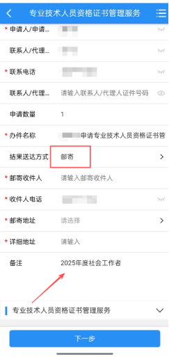 3.“結(jié)果送達(dá)方式”選擇“郵寄”,完善郵寄收件人姓名、電話(huà)、地址等信息,在“備注”欄填寫(xiě)擬申領(lǐng)證書(shū)的考試年度和名稱(chēng),如“2025年度社會(huì)工作者”,點(diǎn)擊“下一步”,最后在跳轉(zhuǎn)的頁(yè)面中點(diǎn)擊“提交申請(qǐng)”即可完成。