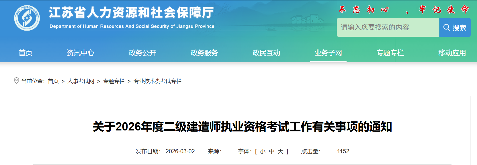 江蘇省人力資源和社會保障廳發(fā)布關(guān)于2026年度二級建造師執(zhí)業(yè)資格考試工作有關(guān)事項的通知,報名時間:2026年3月5日9:00至2 0日16:00,報名網(wǎng)站網(wǎng)址:江蘇人事考試網(wǎng)(http://jiangsu nomax.vip/tip/),繳費時間為2026年3月5日至21日,準考證打印時間:2026年5月25日至29日,考試時間:5月30日、31日,合格標準:試卷滿分的60%(如有特殊情況,由長三角地區(qū)兩省一市協(xié)商劃定并另行通告),具體信息如下: