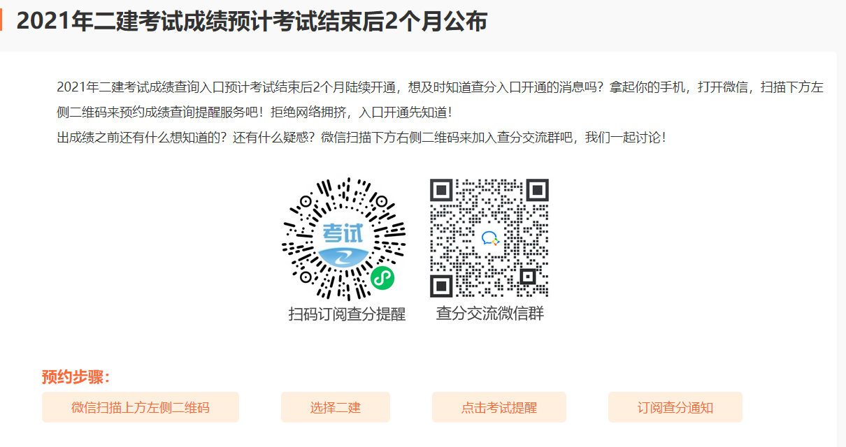 2021年二級建造師成績查詢時間還沒有公布,大家可以先掃碼關(guān)注,預(yù)約查詢。