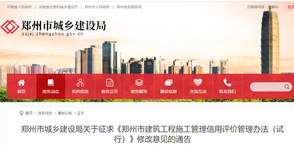 關(guān)于征求《鄭州市建筑工程施工管理信用評(píng)價(jià)管理辦法(試行)》修改意見(jiàn)的通告