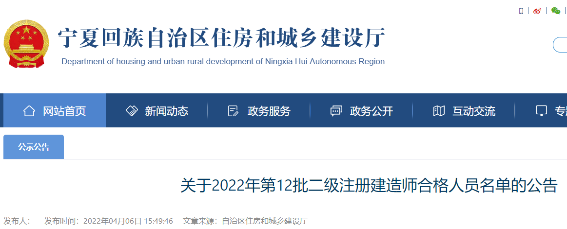 寧夏關(guān)于2022年第12批二級注冊建造師合格人員名單的公告