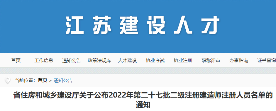 江蘇2022年第二十七批二級(jí)注冊(cè)建造師注冊(cè)人員名單的通知