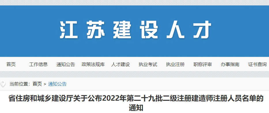 江蘇公布2022年第二十九批二級(jí)注冊(cè)建造師注冊(cè)人員名單的通知