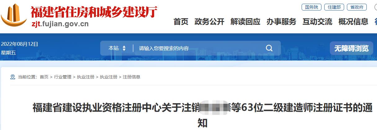 根據(jù)《注冊建造師管理規(guī)定》(原建設部令第153號)和《福建省注冊建造師注冊實施辦法》(閩建筑〔2007〕28號)的有關規(guī)定,63位二級建造師所持有的注冊證書和執(zhí)業(yè)印章已失效,現(xiàn)予以集中省級注銷(名單詳附件),其相應的注冊證書和執(zhí)業(yè)印章作廢。