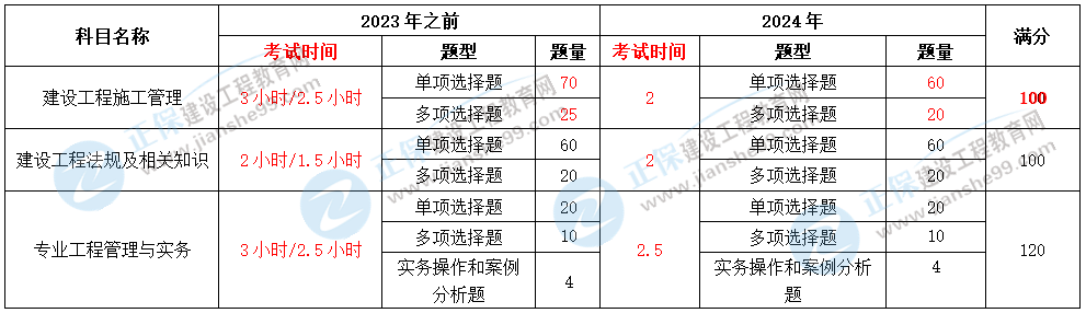 二、施工管理科目的時長縮短、題量下降且滿分從120分調(diào)整至100分。