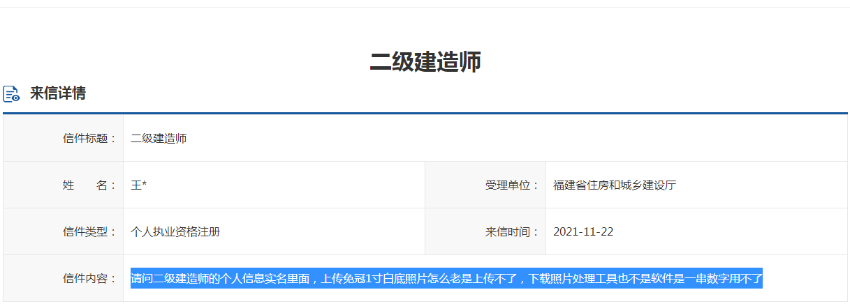 福建省住建廳回復(fù)二級(jí)建造師關(guān)于個(gè)人信息實(shí)名上傳證件照的要求