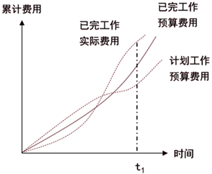 【2016年單選】某工程的贏得值曲線如下圖,關(guān)于t1時(shí)點(diǎn)成本和進(jìn)度狀態(tài)的說法,正確的是(?。?/p>