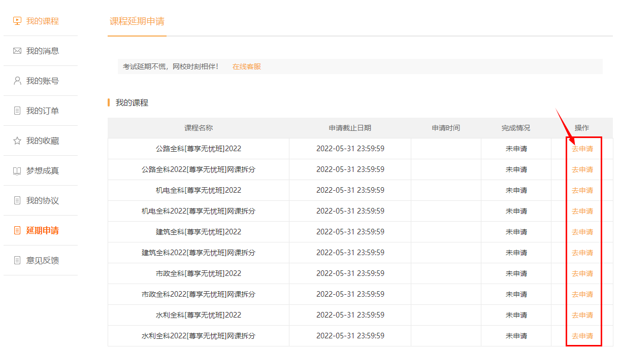 之前在網(wǎng)校報(bào)過(guò)2022年二級(jí)建造師課程的北京考區(qū)的同學(xué),可以申請(qǐng)課程延期,申請(qǐng)時(shí)間為:5月27日-6月20日00:00,入口在“我的網(wǎng)校我的家”,同學(xué)們及時(shí)提交申請(qǐng),不要錯(cuò)過(guò)了時(shí)間。